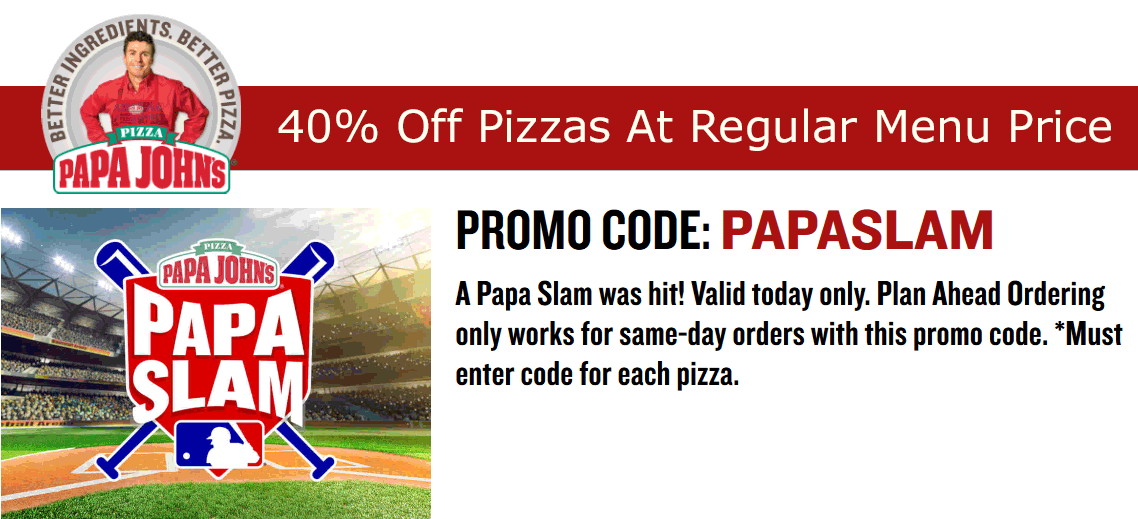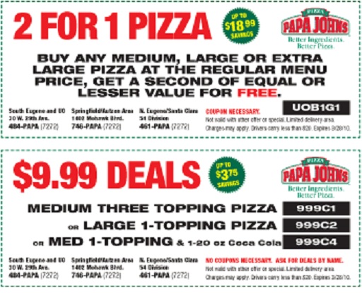 Some Papa Johns locations may not accept online coupons. If this is the case, simply visit Papa Johns company website. There you will be able to choose from a variety of coupons. The upside of looking directly at there site for coupons is that they keep it updated with seasonal promotions and limited time specials that you will not find anywhere else. Likewise, it will be able to provide you with pizza coupons that are specific to your local Papa Johns.